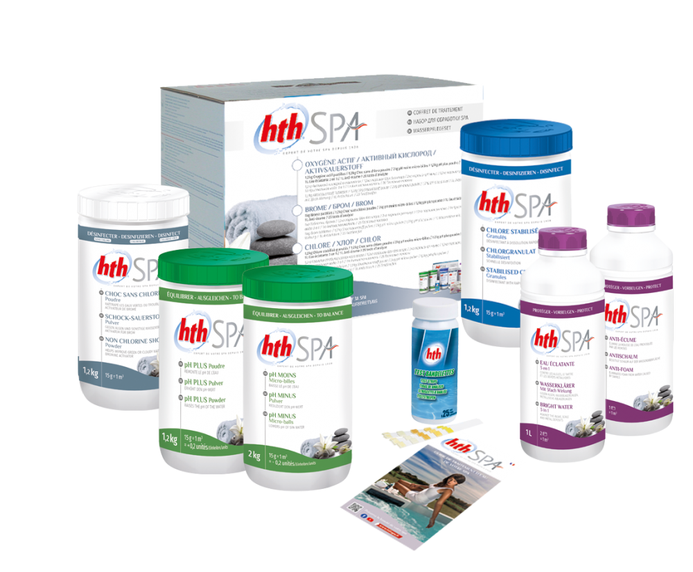 Contient : 1,2 kg hth® Spa chlore stabilisé granulés, 1,2 kg hth® Spa choc sans chlore poudre, 2 kg hth® Spa pH Moins micro-billes, 1,2 kg Spa pH Plus poudre, 1 L hth® Spa Eau éclatante 3 en 1, 1 L hth® Spa Anti-écume, 1 hth® Spa guide de traitement d'eau, 1 tube de 25 Tests bandelettes hth®